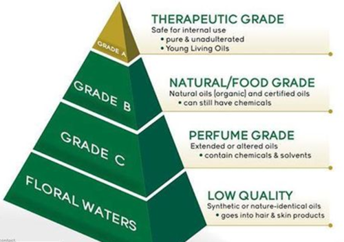 However, some manufacturers use solvents to extract the oils. This extraction method uses chemical solvents to do this. The oils that have been extracted are subject to an additional step requiring very high heat to remove the solvent. This degrades the quality of the essential oil. The attached chart indicates the different grades of essential oils.